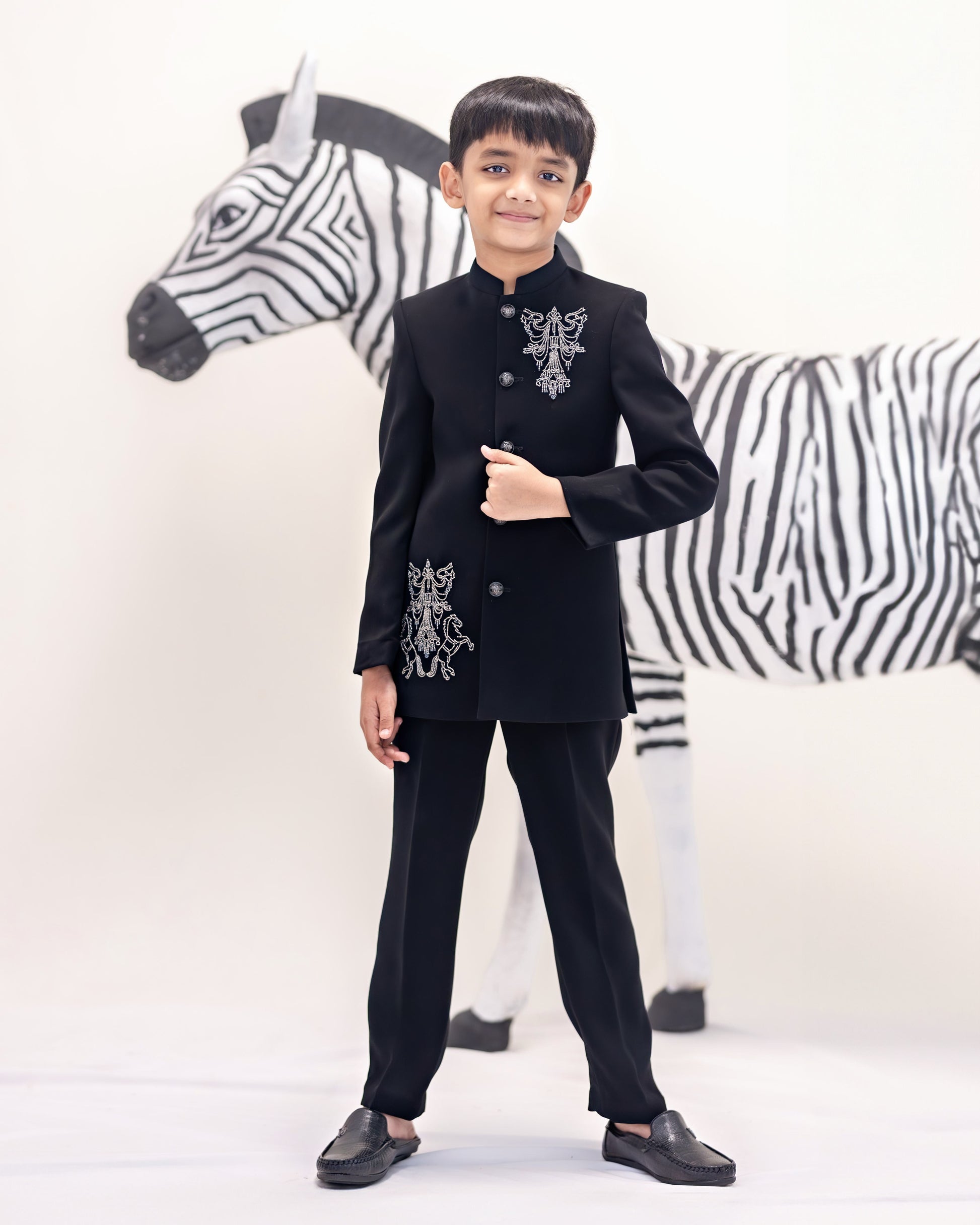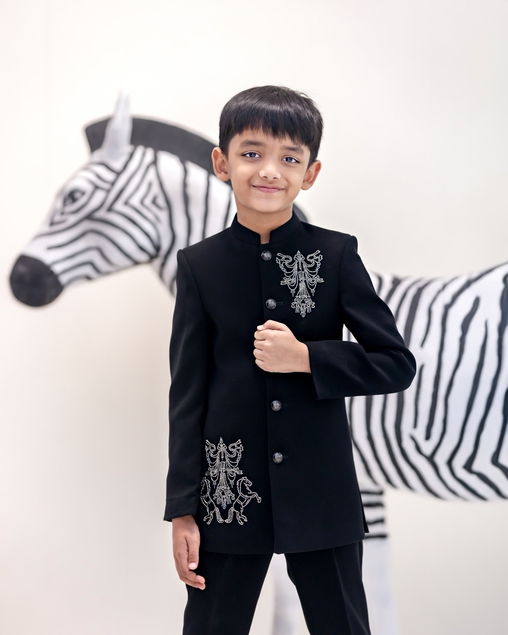 A BLACK BANDH GALA WITH CREST EMBROIDERY TEAMED UP WITH BLACK TROUSER